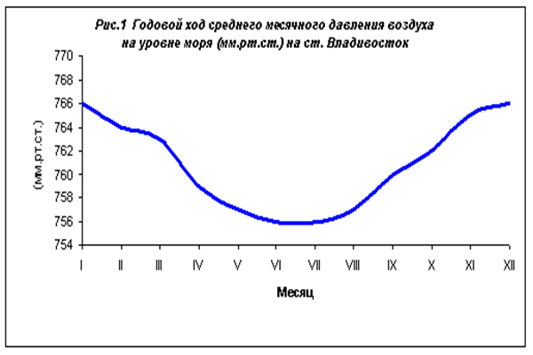На рисунке представлен годовой ход среднего месячного атмосферного давления по Владивостоку. Такой ход атмосферного давления (с зимним максимумом и летним минимумом) является типичным для континентальных районов, а по величине годовой амплитуды (около 12 мм. рт. ст.) может быть отнесен к переходному типу: от материкового к океаническому.