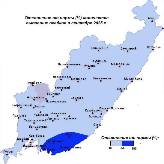 - В связи со смещением активного циклона вблизи побережья Приморского края днем 24 и ночью 25 сентября в южных и восточных районах прошли сильные дожди с количеством 15–35 мм за 12 часов и менее. Наиболее интенсивные дожди отмечались на юго-востоке края: ночью 25 сентября на 2 метеостанциях (Находка и Ольга) выпало 49 и 44 мм (близко к критерию ОЯ), на мс Преображение прошел очень сильный дождь – 55мм за 6 часов. Суммарное количество осадков в этих районах составило 2–3,5 декадной нормы.