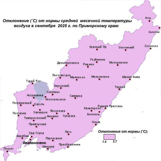 Сентябрь-2025 по температурному режиму выдался тёплым. На большей территории Приморья наблюдался дефицит осадков, только местами дождя выпало около нормы и выше. Средняя месячная температура воздуха составила 13,6–19,4°С, что выше средних многолетних значений на 1,4–2,7°С. Тёплыми были все декады.