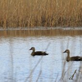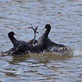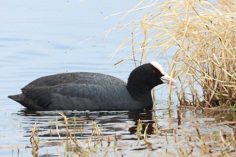 Утки в апреле всё чаще встречались парочками. Вот рядышком плавают селезень и уточка чирков-свистунков, а вот тихо «потьёкивает» парочка лысух. Лысухи, из отряда пастушковых, сплошь чёрного цвета, только короткий клюв и лобная бляшка белого цвета. Длинные ноги серого цвета, а на пальцах фестончатые плавательные лопасти. Они особенно заметны, когда утки стоят на камнях или, соперничая, сражаются друг с другом с помощью ног. Тогда их фестончатые лапы похожи на лапы дракона. Это можно увидеть на замечательных снимках фотографа-натуралиста Ольги Васик.