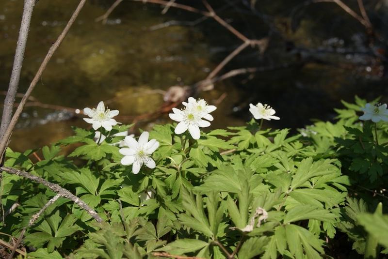 Зелёные краски в апреле появляются не сразу, постепенно. В пойме сначала среди сухой пожухлой прошлогодней травы и листьев появляются острые свёрнутые початки ярко-зелёных листьев чемерицы. Вслед за ней в середине апреля всходят крупные сизо-зелёные листья гусиного лука, который вскоре зацвёл. Выделяются своим ярким изумрудным цветом всходы ллойдии трёхцветковой, которая зацветает в начале мая. Вслед за гусиным луком дружно взошёл лук одноцветковый, образуя целые куртинки из нежных листиков. Они, кстати, съедобны и чем-то похожи по вкусу на черемшу, всходы которой появляются в начале апреля, а уже к концу месяца его листики развеваются высоко над землёй. Здесь же в пойме в третьей декаде повсеместно белели полянки ветреницы амурской, самой массовой в это время, наравне с чемерицей. Сообща, они создавали бело-зелёный аспект на фоне пожухлой прошлогодней листвы. Местами желтели головки селезёночника волосистого, начинала цвести калужница, голубела ещё кое-где хохлатка сомнительная. Появились всходы лабазника и водосборов.