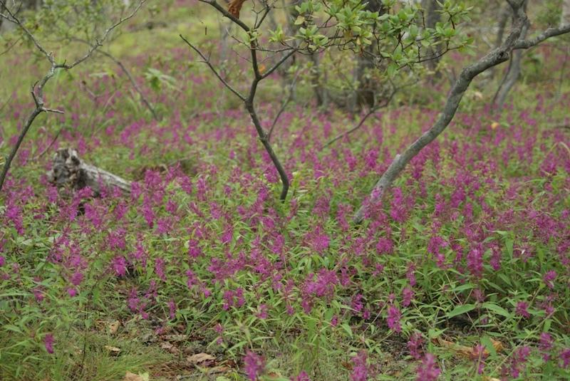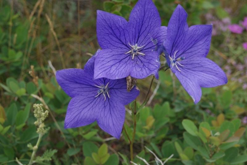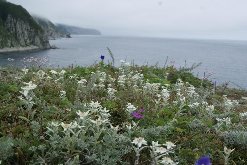 На морской террасе бухты Удобной (Благодатное) серебрятся в изобилии головки эдельвейса Палибина. Среди них краснеют алые китайские гвоздики, пронзительно синие ширококолокольчики крупноцветковые. Вот колокольчик ещё не распустился и выглядит, как коробочка-шкатулка — широкие синие лепестки вот-вот распахнутся, и коробочка превратится в прекрасный цветок. Неподалёку роскошно цветёт пышный куст горца Юрия. Его мелкие белые цветы источают очень приятный медовый запах.
