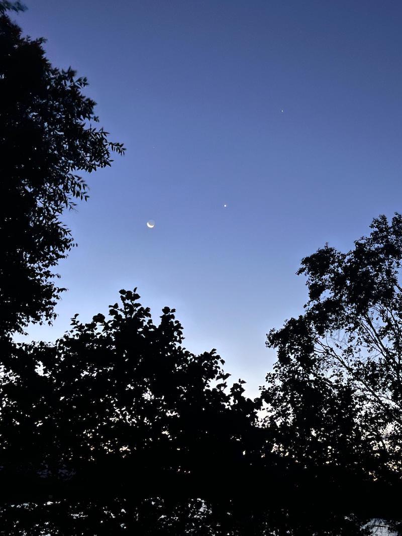 А 13 августа рядом с планетами наблюдалась убывающая яркая Луна, которая была чуть левее Венеры. С каждой ночью расстояние между планетами увеличивалось. Ранним утром 20 августа в предрассветные часы над этой парой располагался уже тонкий месяц Луны в лежачем положении, как чаша. Юпитер чуть сбоку и ниже месяца и ещё ниже Венера. Тоже очень красиво. А 21 августа в пять часов утра (за час до восхода Солнца) тонкий месяц располагался уже чуть ниже и левее Венеры. Над горизонтом в это время полыхала алая полоска рассвета.