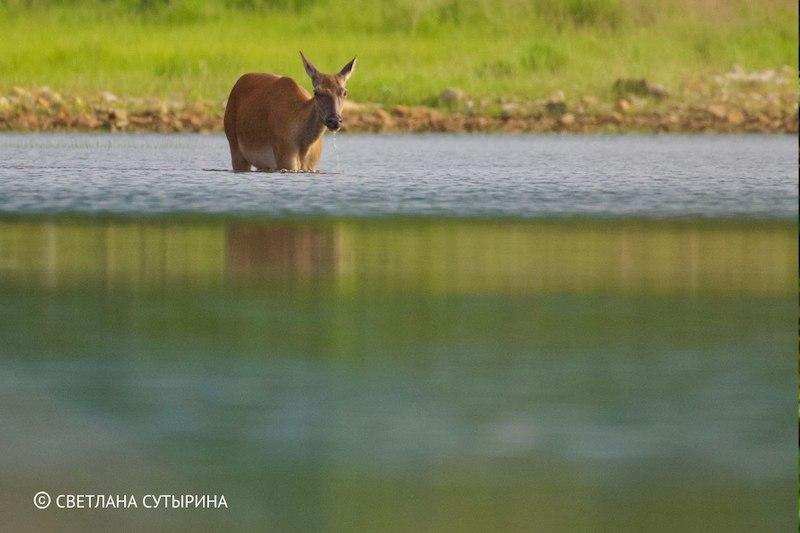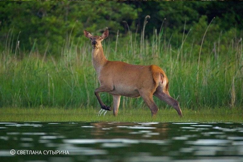 На озере Благодатном птиц в августе немного — немного уток и цапель, белых и серых. На дальнем западном берегу озера довольно часто можно увидеть изюбрей, стоящих или на берегу, или в воде. Их привлекает сюда водная растительность, содержащая намного больше минеральных веществ, чем наземная. Поэтому изюбрей здесь можно увидеть и весной, и летом. Они поедают водоросли и особенно — рдест гребенчатый. Поскольку копытных видят чаще на западном берегу озера, можно сделать вывод, что именно там сосредоточены запасы этого водного растения. Вот стоит по грудь в воде молодая изюбриха и жуёт рдест. Её внимание что-то привлекло, она вышла из воды и стоит, повернув голову в сторону объектива и грациозно приподняв левую переднюю ногу. Она внимательно смотрит в эту сторону и поводит своими красивыми длинными ушами. И наконец, она стремительно бежит по мелководью, поднимая шлейфы брызг. Очень красиво.