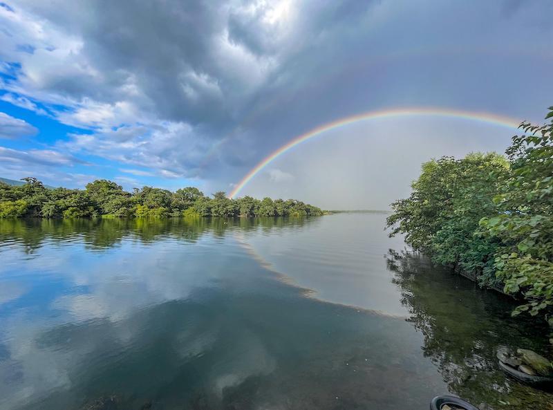 Самой тёплой и жаркой была первая декада, часто днём до +30 градусов. Сильный дождь, тропический ливень, пролился 4 августа, разбудив нас утром громким шумом обрушившихся на крыши потоков воды, да ещё при сильных порывах западного ветра. Поливал он нас часа два, потом заморосило, ветер стих. Вода в Вилке моментально вздулась и помутнела, но подъём воды был небольшим. Второй заход тропического ливня начался в четвёртом часу дня. Опять хлестало с порывами ветра, вода не успевала впитываться, заливая землю сплошным потоком. На сей раз ливень длился около получаса. Дождь прекратился, тучи быстро разбежались, и выглянуло солнце, а над Серебрянкой раскинулась пологая радуга. Вся эта вакханалия была очень похожа на грозу, но молнии не сверкали, и гром не гремел. Несмотря на дождь и ветер, было душно и влажно. Влажность достигла ста процентов.