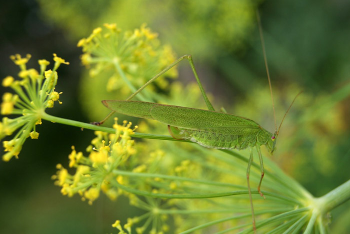 Вот присел на укроп зелёный кузнечик. Его и не заметишь сразу, так искусно он маскируется среди зелени. В лучах утреннего тёплого солнца после прохладной ночи он как бы принимает солнечные ванны, долго находясь на одном месте, временами подставляя солнцу другой бок. Стрекотание кузнечиков было слышно в течение всего месяца и днём, и вечером.