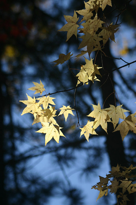 И только со второй половины третьей декады на побережье замелькали жёлтые пятна на сопках. Стали багряными, жёлтыми, оранжевыми клёны мелколистный, зеленокорый, жёлтый. Под пологом леса доцветали голубые цветы аконитов. Полетели с бархата длинные жёлтые листочки. Липа стояла лимонно-жёлтой. Дуб зазолотился на ближайших сопках. Листопад заметно усилился.