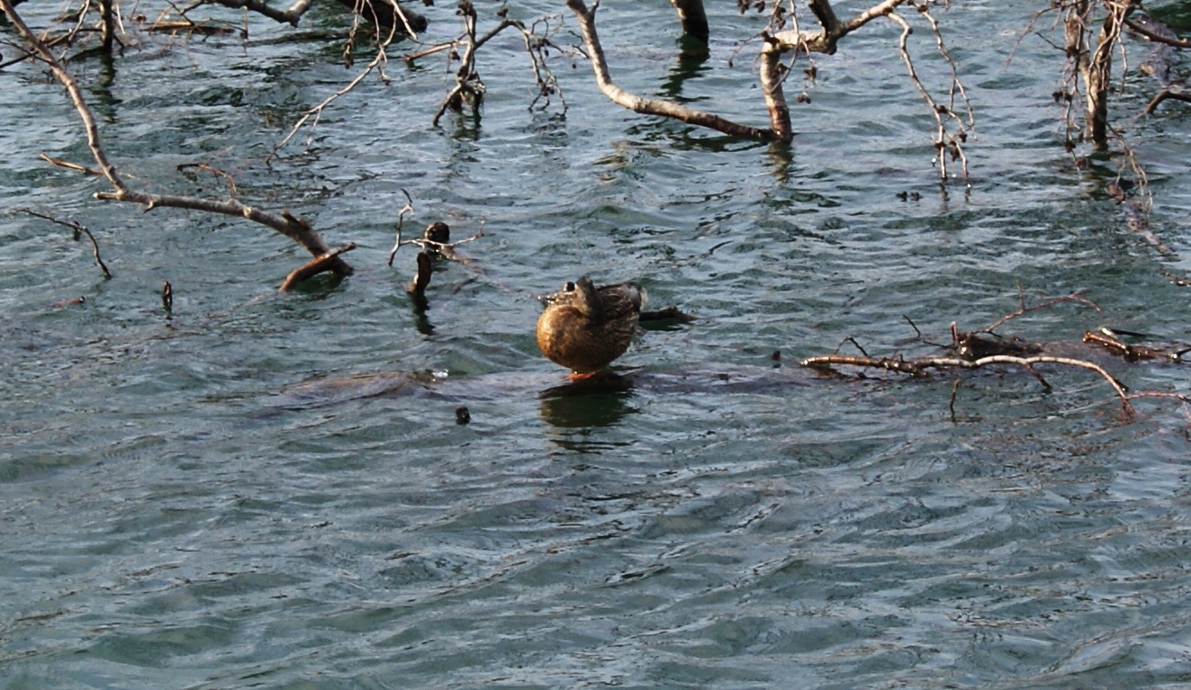 В конце месяца на Вилке всё ещё была заметна бурая оляпка. Вот она взлетела на мостик, повертелась, покачивая хвостиком, и опять нырнула в воду. В этом марте она задержалась здесь дольше обычного, но скоро переберётся выше по течению реки, где будет гнездиться. А неподалёку от неё, на берегу в тени частых молодых топольков стоит селезень кряквы. Я его сразу и не приметила. Довольно крупный. Крутая коричневая грудь, яркая зелёная голова, жёлтый клюв, чёрный глаз сверкает на солнце при повороте головы в мою сторону. Отдыхает. Чуть ниже по течению плавают три чёрные кряквы, сверкая на солнце своими жёлтыми кончиками клювов. К ним присоединяется парочка чирков.