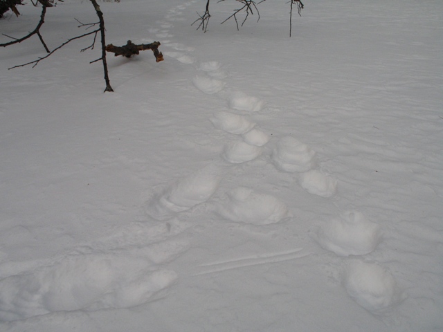 В третьей декаде марта замечены были на снегу следы медведей, не только бурых, но и гималайских, которые просыпаются обычно в середине апреля, когда снег уже сходит почти всюду. Сначала просыпаются взрослые бурые самцы, потом — помладше, в апреле выходят из берлог медведицы с медвежатами и гималайские. В эту весну гималайцы кое-где поспешили. В среднем течении реки Заболоченной были встречены следы тигра и бурого медведя на одной тропе (фото Следы тигра и бурого медведя на одной тропе, Сутырина С.). Сначала медведь шёл за тигром, а потом и тигр тропил медведя. Медведь вышел из берлоги голодный, кругом ещё много снега, поэтому и ходит он за тигром в надежде подъесть за ним его добычу. А вот почему тигр за ним пошёл? Судя по наблюдениям это молодая самка, тягаться с медведем ей совершенно ни к чему — опасно. Может, это случайность, а, может, любопытство. Остаётся только догадываться.