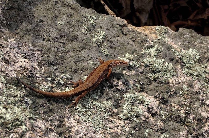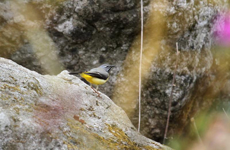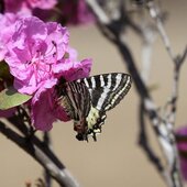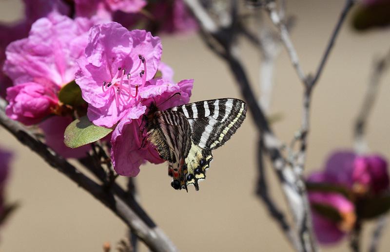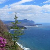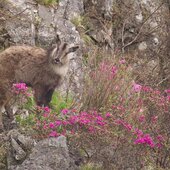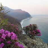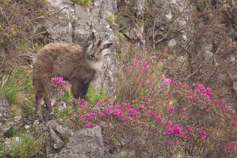 В урочище Голубичное на прибрежных скалах среди цветущего рододендрона повстречался амурский горал. Основная группировка находится в урочище Абрек, чуть севернее. Но и здесь, на Голубичном, их можно увидеть. На снимке молодая самка в возрасте около двух лет. У горалов небольшие рога есть и у самцов, и у самок, которые они носят всю жизнь, не сбрасывая их, как олени, изюбри и лоси. При каждой линьке у основания рогов появляются новые роговые кольца, образуя уникальный рисунок. Это позволяет идентифицировать каждую особь, подобно тому, как тигров определяют по полоскам. Самка горала на снимке линяет, поэтому её мех не серый, как обычно, а буро-коричневый.