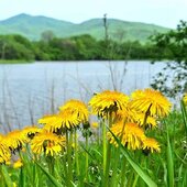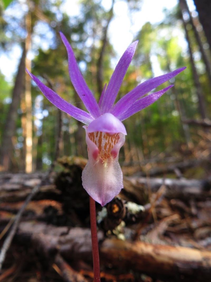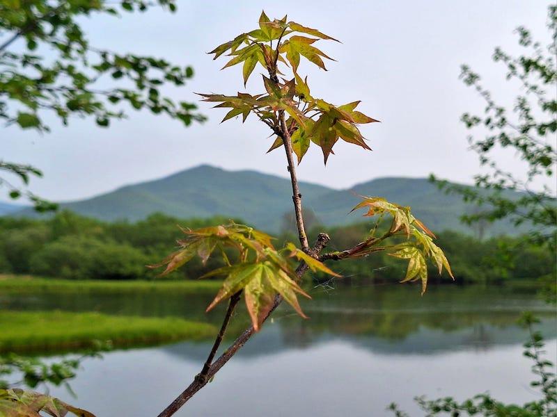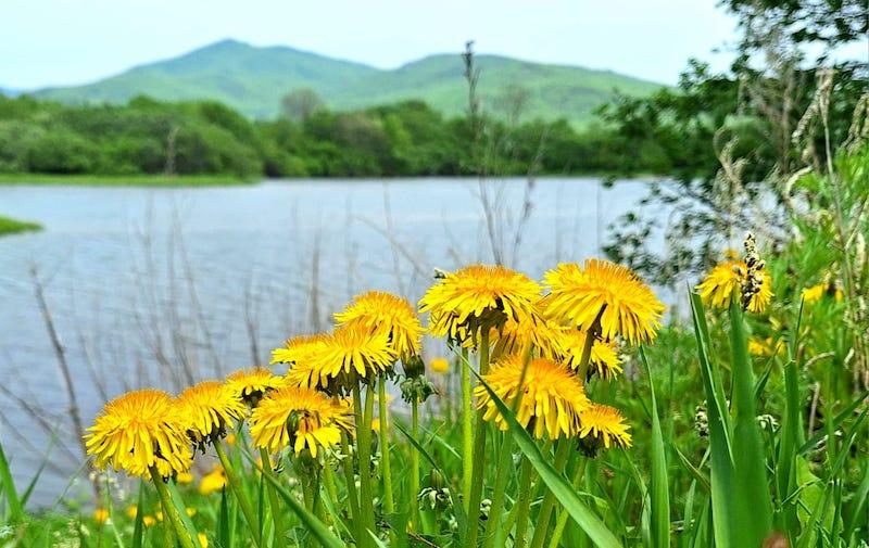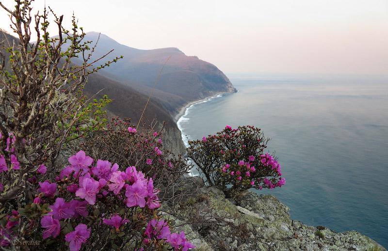 Весь май цвёл на сопках рододендрон. Цветение его не было особенно пышным, цветов было немного. Одновременно с цветением появились молодые светло-зелёные листики, они были хорошо заметны на фоне старых коричнево-бурых листьев. В конце месяца зацвели водосборы, ландыши, венерины башмачки, фиалки заострённые и маньчжурские, ветреницы удские и коротконожковые, клинтония удская, пион японский. В хвойно широколиственном лесу на Зимовейном цвели невысокие орхидеи — изящные калипсо луковичные, пахнущие ванилью. И конечно, радовало изобилие одуванчиков, заполонивших все поляны.