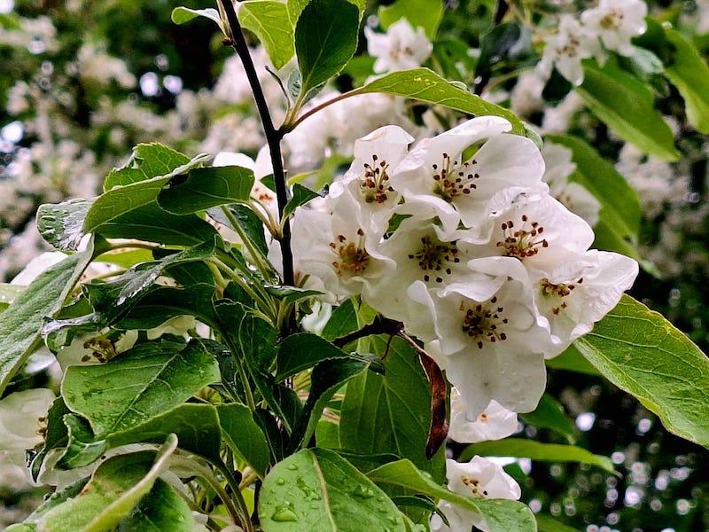 В конце мая ещё цвела черёмуха, зацвели яблоня, боярышник, барбарис, благоухала в садах сирень.