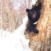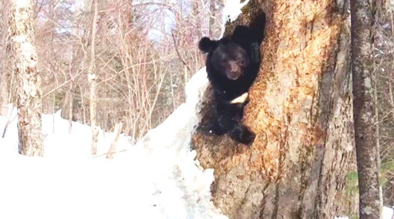 Один такой случай был запечатлён фотоловушкой в середине марта этого года и выставлен в Telegram-канал без указания места происшествия, но явно в Приморье. Походив вокруг «своего» дерева по глубокому снегу, гималайский медведь вернулся к дуплу, которое находилось в толстой липе, и стал забираться в него назад. Он полез в него передом, опёршись задними лапами о край дупла и выставив наружу свою кругленькую «пятую точку». Потом повернулся боком, задвинул в дупло левую половину тела, опёршись правыми лапами о край дупла и выставив свою морду наружу. Вид у него был очень забавный. Затем он втиснулся в дупло всем своим телом, убрал лапы внутрь и потихоньку стал сползать вниз в дупло, пока весь в нём не исчез. Значит, дупло было глубоким, но находилось оно невысоко от земли. Примерно на уровне снега. Медведь решил ещё поспать.