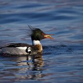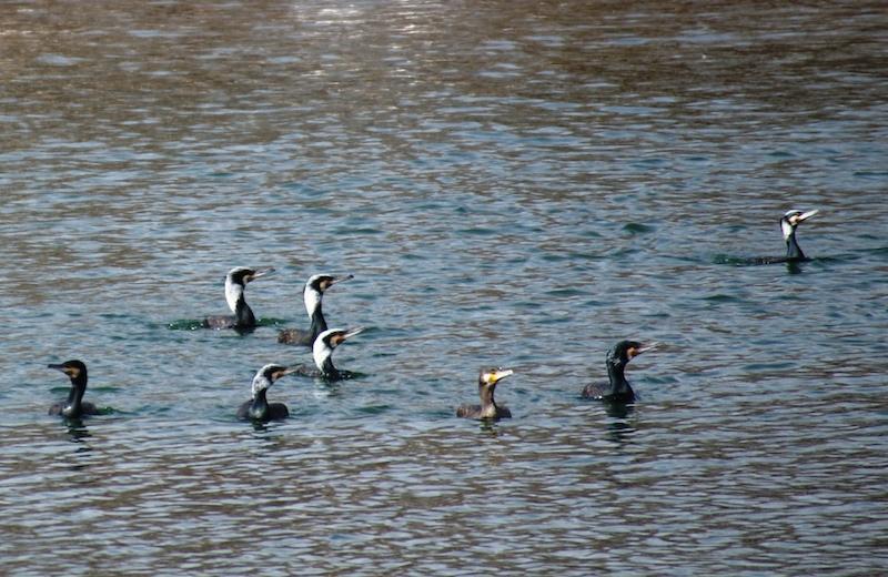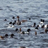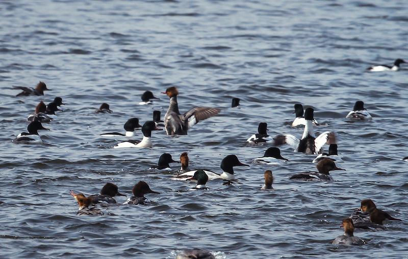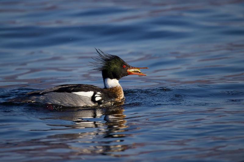 В начале марта в бухте Удобная засняли зимующего у нас длинноносого крохаля. Он ловко поймал бычка своим длинным клювом и проглотил его. Для удержания добычи ноготок на конце длинного узкого клюва у крохалей превратился в крючок, а пластины цедильного аппарата — в направленные назад зубцы. А клюв у этого крохаля длинный и красный. На чёрном затылке у самца двойной хохол из рассученных перьев. Утка хорошо заметна по белому широкому кольцу вокруг шеи и белым пятнам ближе к крылу. Вид этот многочисленный, обычный зимующий на морской акватории и редкий летующий на приморских озёрах и в море.