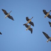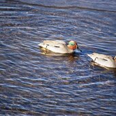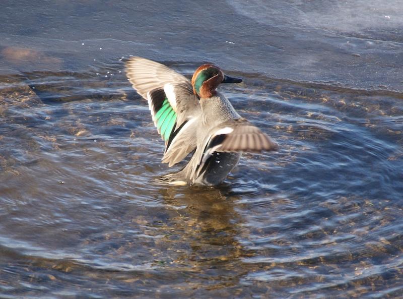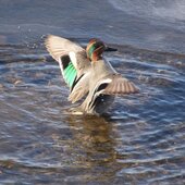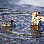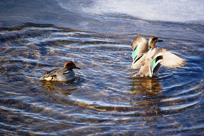 Кстати, кряквы и чирки-трескунки являются одними из основных объектов охоты, к сожалению. Чирки — самые мелкие из уток. Меньше всех – чирок свистунок, чуть крупнее его – чирок-клоктун или просто клоктун и чирок трескунок. Свистунок среди них самый многочисленный и обычный, пролётный и иногда зимующий вид. Мы его, в основном, и видим. Весной он в полёте издаёт нежный свист. Клоктун редок и бывает у нас на пролёте. В полёте издаёт глухие клокочущие звуки. А трескунок — это малочисленный пролётный и редкий гнездящийся вид приморских озёр. В полёте сухо и раскатисто трещит. Эти три вида чирков вдвое меньше крякв и рядом с ними кажутся очень мелкими. И все чирки очень красивые утки, самцы, конечно, самочки — бурые и рябенькие. Кстати, если кряквы гостят у нас долго и гнездятся, то чирки долго здесь не задерживаются. В начале апреля я свистунков рядом с кряквами уже не видела, улетели.