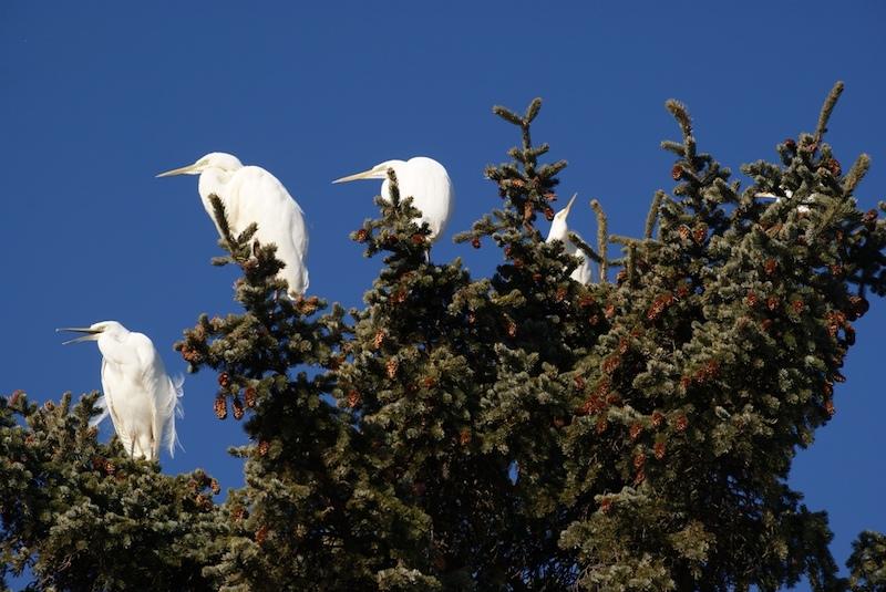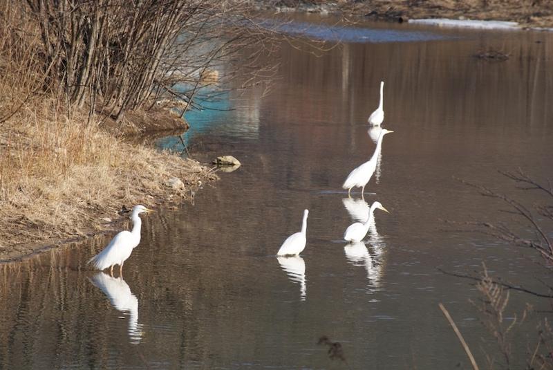 В конце третьей декады, 26 марта, рано утром, как взошло солнце, в один из дворов на ёлки, сосну и лиственницу уселись большие белые цапли, которые в лучах яркого солнца казались белоснежными цветами, 12 цапель. Видимо, из только что прилетевших. Отдыхали, осматривались, грелись на солнце. Время от времени некоторые из них слетали вниз в речку, посмотреть, нет ли там чего поесть, и опять возвращались на деревья. Сидели они так долго, около часа. Потом постепенно, по одной-две, улетали в сторону Серебрянки. В эти числа, с 25 по 28 марта, белые цапли уже который год по прилёту усаживаются на эти деревья, отдохнуть. Один день. Потом иногда возвращались, но уже не в большом количестве, одна-две.