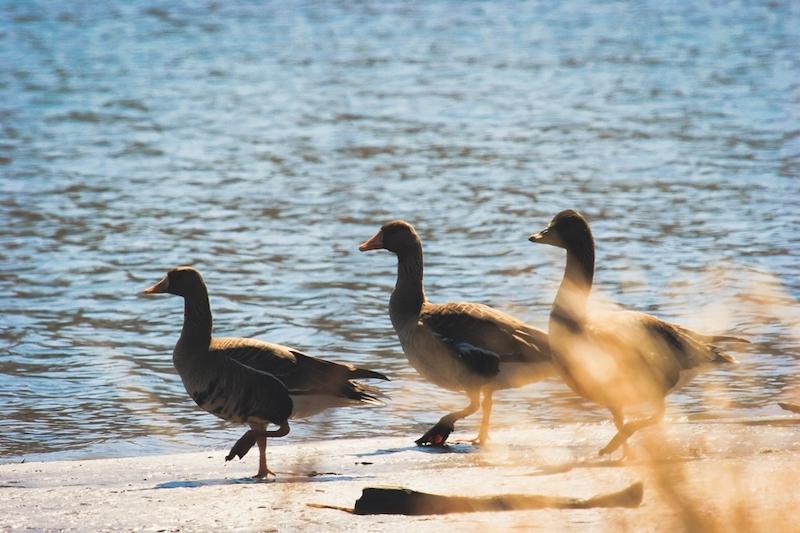 С этого времени утки и цапли стали часто видны в небе, летящими над рекой. Чёрные кряквы иногда поднимались на берег и копошились в сухой траве. Речные, благородные (род Anas), утки питаются мелкими беспозвоночными (насекомыми и их личинками, рачками, моллюсками) и водными растениями.
