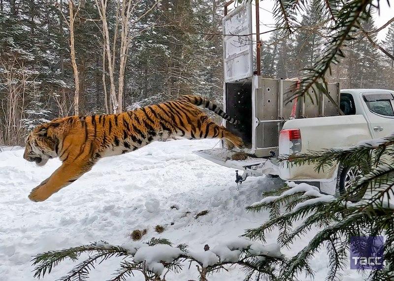 Недавно в районе Барабаша на юге Приморья отловили самца тигра в прекрасном состоянии, здорового, упитанного. Рядом находится национальный парк «Земля леопарда», в котором, как утверждают, копытных много, для хищников хватает. И кабанов, кстати, стало побольше, чем в прошлом году, как показали результаты зимнего учёта. После обследования тигра выпустили на свободу в северном Приморье в малонаселённой местности. Момент выпуска заснял фотокорреспондент ТАСС Юрий Смитюк. Красивый мощный тигр с рёвом стремительно выскочил из машины и на прыжках быстро удалился в лес. Метод релокации, то есть перемещения тигра на иную территорию, является эффективным способом решения конфликтных ситуаций между амурским тигром и человеком. В конце января люди, проезжающие через заповедник по дороге Терней-Пластун, не раз видели чуть в стороне от дороги, среди деревьев, трёх тигрят Северины, обитающих в урочище Благодатном. Правда, их уже и тигрятами назвать трудно, в возрасте восьми месяцев они кажутся взрослыми тиграми и подолгу могут находиться без матери. Вели они себя спокойно. Участок этого семейства расположен между Пластуном и Тернеем. То есть их можно заметить не только в районе Благодатного, но и ближе к Пластуну, и ближе к Тернею. Следы тигров иногда замечают и на пляже Малой Бухточки, и на ближайших сопках. А в Левом Тернее, говорят, ходит тигрица с двумя тигрятами. Так что тигриных новостей и у нас много.
