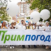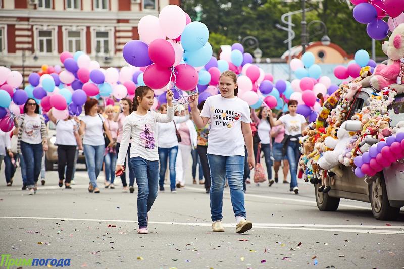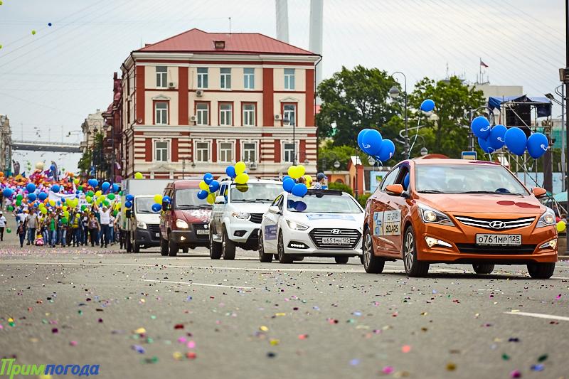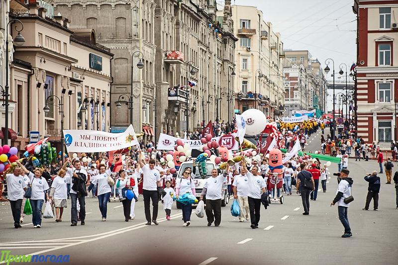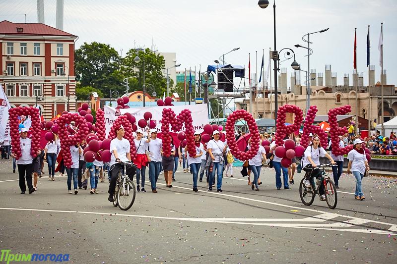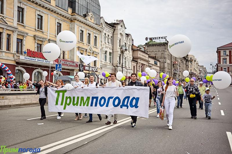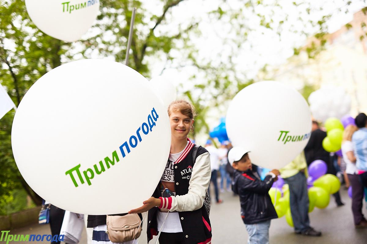 В этом году Примпогода решила принять самое непосредственное участие в празднике — солнечная колонна друзей нашего сайта с воздушными шариками и белыми флагами прошла по центру города, поздравляя горожан и гостей Владивостока с праздником.
