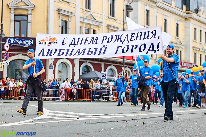 Поздравили Владивосток и приняли участие в театрализованном шествии почётные граждане, ветераны, педагоги, представители сферы культуры и искусства, спортсмены, врачи, военные, общественные организации, сотрудники образовательных учреждений города, казаки, банковские работники, представители малого и среднего бизнеса, промышленных предприятий, компании сотовой связи, интернет-провайдеры, представители молодёжи, творческих коллективов и диаспор в национальных костюмах. Горожане украсили свои колонны воздушными шарами, флажками и транспарантами.