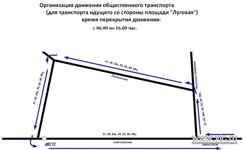 С 6:00 до 16:00 автобусы, следующие со стороны площади Луговой, на «Авангарде» будут сворачивать направо и двигаться в центр по улице Пушкинской. На остановке «ДВГТУ» автобусы будут разворачиваться и следовать в обратном направлении.