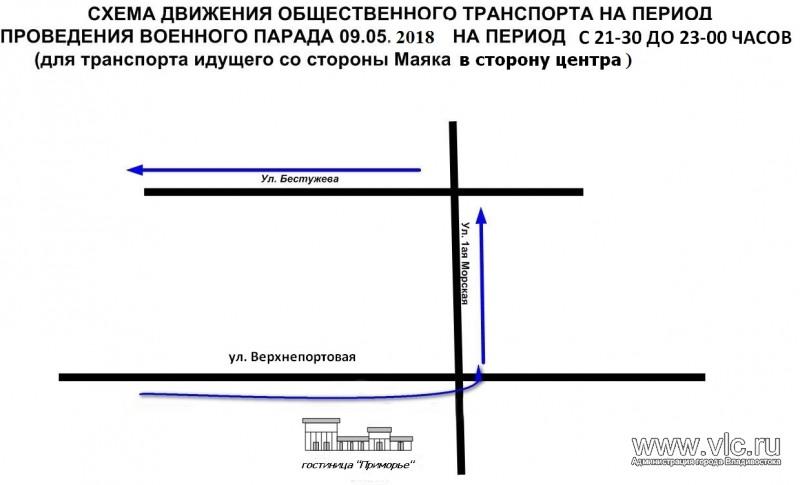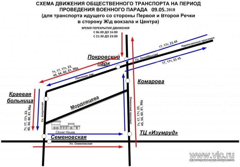 Автобусы, чьи маршруты пролегают от Первой и Второй речки в сторону центра и железнодорожного вокзала, с 6:00 до 16:00 и с 21:30 до 23:00 в районе торгового центра «Клевер Хаус» будут поворачивать налево и двигаться в обратном направлении по Океанскому проспекту.
