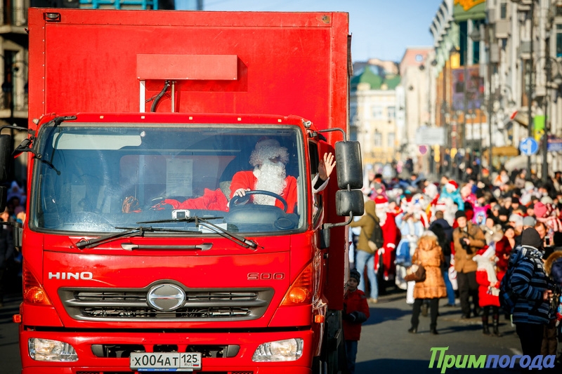 В субботу, 19 декабря, во Владивостоке впервые состоялось праздничное шествие Дедов Морозов. По Океанскому проспекту прошли порядка тысячи горожан и гостей города всех возрастов — Деды Морозы, Снегурочки, их сказочная свита и все желающие. Самых юных участников в костюмах Дедов Морозов родители везли в колясках.