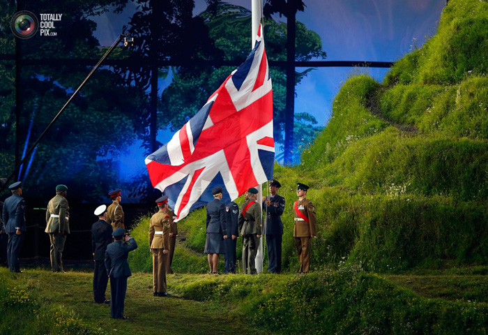 Специально для открытия королева Елизавета II снялась в небольшом ролике в стиле знаменитого фильма "Джеймс Бонд", а известный на всю планету Ролан Аткинсон — "мистер Бин" — научился играть на синтезаторе. После парада стран, был зажжен Олимпийский огонь. Закончилась церемония выступлением сэра Пола. Участник группы "Битлз" спел "Hey Jude".