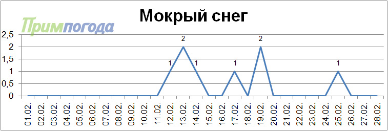 Мокрый снег — не частый февральский гость. За всю почти столетнюю историю метеонаблюдений он бывал о Владивостоке лишь 8 раз — из них по 2 раза 13 и 19 февраля.