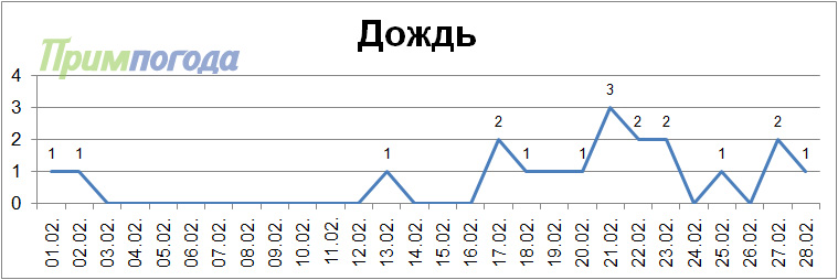 Чем ближе подходит конец зимы, тем настойчивей весна дает о себе знать — то и дело идет дождь. Самый дождливый день месяца — 21 февраля.