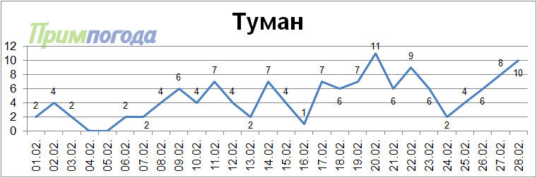 Так и туман наблюдается тем чаще, чем ближе к своему завершению подходит месяц. Самый туманный день — 20 февраля: 11 случаев за всю почти вековую историю погодных наблюдений.