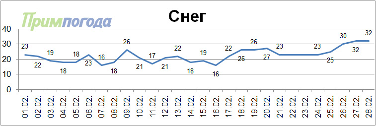 Снег в феврале идет довольно часто, но более всего снежных дней приходится на конец месяц. Так, 27 и 28 февраля снег выпадал 32 раза.