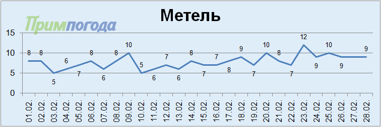 Переняв эстафету у метелей январских, в феврале метели засыпают Владивосток снегом так же часто: 219 раз, 12 из которых приходятся на 23 февраля.