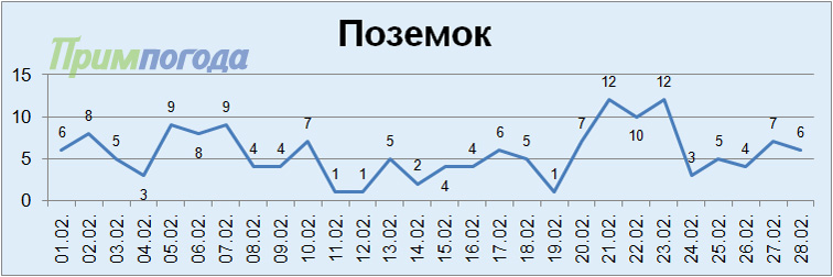 По 12 раз 21 и 23 февраля фиксировался метеорологами поземок.
