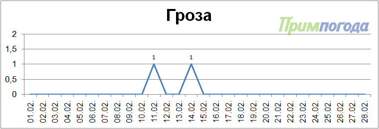 Наиболее редким для февраля явлением во Владивостоке стала гроза. Раскаты ее могли услышать горожане лишь дважды: 11 февраля 1962 года и 14 февраля 2007 года.