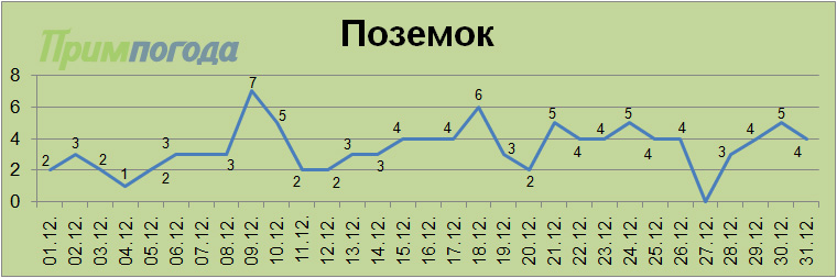 Привычным явлением для декабря становятся метели. Максимальное количество — 11 случаев — приходится на 24-е число месяца.