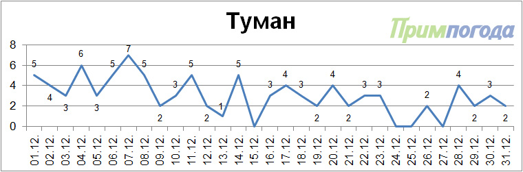 Редки в начале зимы и туманы. Максимальный показатель зафиксирован 7 декабря — 7 случаев.