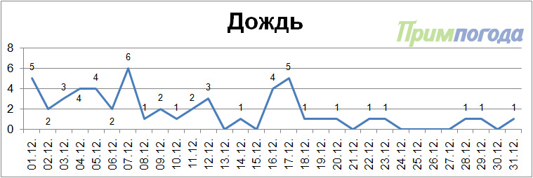 Дождь, напротив, наблюдается всё реже. Самыми дождливыми днями в декабре стали: 7 декабря — 6 случаев осадков, а также 1 и 17 декабря — 5 случаев. Однажды дождь во Владивостоке шел в канун Нового года — 31 декабря 1936 года при температуре воздуха +2.7 °С.