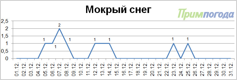 А вот осадки в виде мокрого снега наблюдаются в декабре несколько чаще. Метеорологи зафиксировали 9 подобных случаев, 2 из них выпало на 7 декабря.