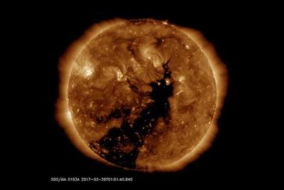 Гигантская дыра в атмосфере Солнце смотрит прямо на Землю, испуская стремительный поток солнечного ветра к нашей планете. Обсерватория солнечной динамики НАСА получила фотографию коронального «каньона» 25 марта.