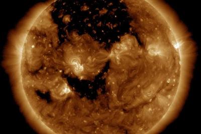 Такая же корональные дыра снова поворачивается к Земле. Обсерватория солнечной динамики НАСА сфотографировала структуру 20 ноября. Теперь, когда корональная дыра вернулась, мы можем видеть, что отверстие не столь велико, как это было месяц назад. Но это по-прежнему впечатляет, структура корональной дыры охватывает почти одну треть видимого солнечного диска.