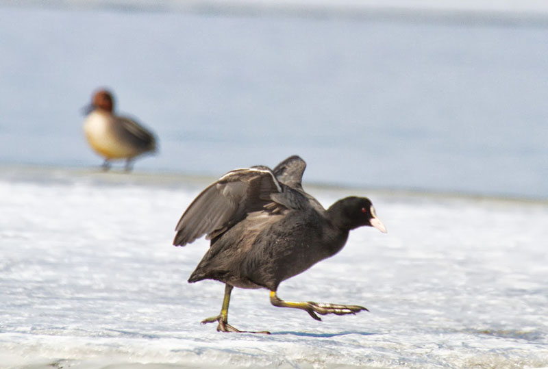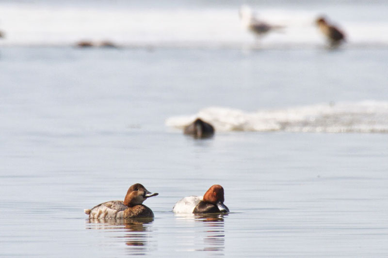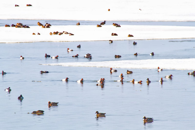 Эта весна для меня началась с удивительного скопления водоплавающих в устье Второй речки. Здесь и лысухи с белыми клювами, и кряквы, и красноголовые нырки, и хохлатые чернети. Все они отдыхали после трудного перелета, ждали, когда реки вскроются ото льда, и подкреплялись водорослями, растущими в устье речки. Большинство птиц уже держались парами, временами трогательно ухаживали друг за другом.