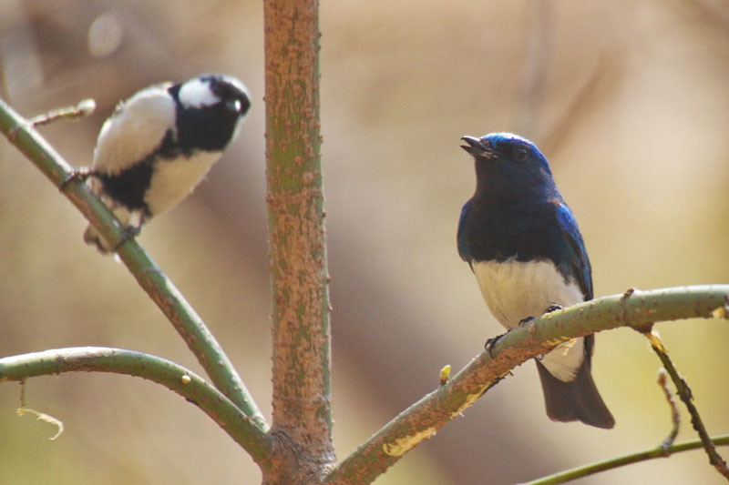 Самым удачным для фотоохоты днем оказалась Пасха. Во дворе я заметила синюю мухоловку (вспомнилось, как пару лет назад я бегала за ней по лесу, пытаясь хоть как-нибудь снять, а тут она в метре от меня, да не одна). С фотоаппаратом я любуюсь и синей, и таежной мухоловоками, и синицами и пеночками. Встав пораньше следующим утром, надеясь поснимать снова, я нашла во дворе только воробьев, но что поделаешь — пролет.