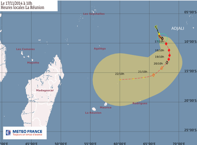 «Аджали» смещается на юго-восток со скоростью 6 км/ч. Однако в перспективе, как прогнозирует Региональный центр слежения за тропическими циклонами на острове Реюньон, он повернет на юго-запад в сторону Мадагаскара.