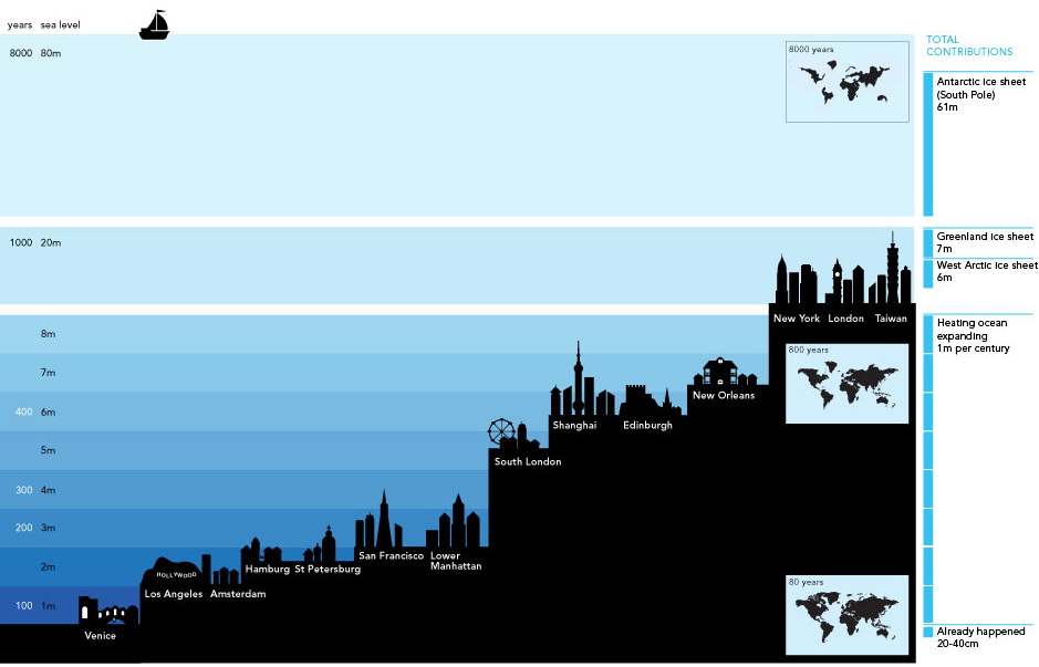 Согласно расчётам научных сотрудников Потсдамского института изучения климатических изменений (Германия), к 2100 году уровень Мирового океана повысится на 0.75 — 1.9 м. Такое повышение уровня Мирового океана представляет серьёзную угрозу для Венеции, Лос-Анджелеса, Амстердама, Гамбурга, Санкт-Петербурга, Сан-Франциско, Нижнего Манхэттена. Изображение ниже иллюстрирует прогнозы повышения уровня моря, а также города, на которые оно повлияет.