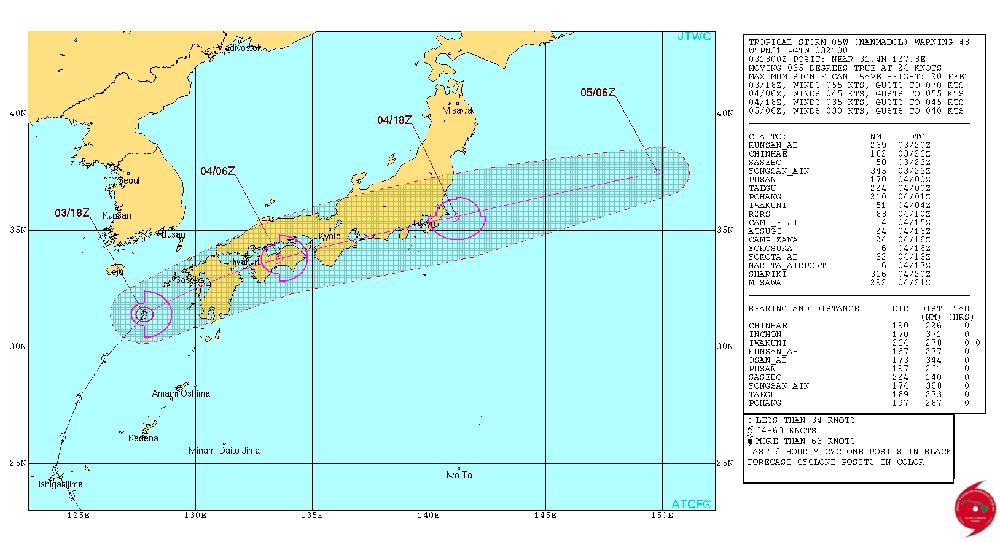 Сегодня утром тропический шторм «Нанмадол» находился в районе с координатами 31.3 с.ш. и 127.7 в.д. в Восточно-Китайском море. Давление в центе тайфуна составляет 985 гПа. Максимальная скорость ветра вблизи центра вихря достигает 27 м/с, порывами до 40 м/с.