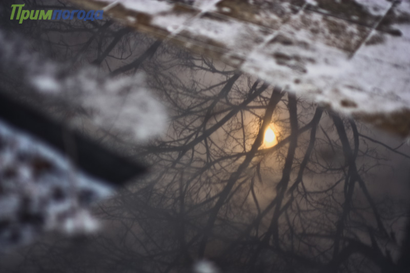 В воскресный день по территории Приморья проходил малоактивный атмосферный фронт, который стал причиной выпадения в течение дня небольшого снега в южных, западных и на юге центральных районов. Количество выпавших осадков составило от 0.1 до 1 мм. В тех районах, где было облачно и шел снег, интенсивного прогрева воздуха в течение дня не было, и воскресный день был на 2–4 градуса холоднее субботы. Очаг тепла переместился на восточные районы. При малооблачной погоде воздух здесь местами прогрелся до +3 °C.