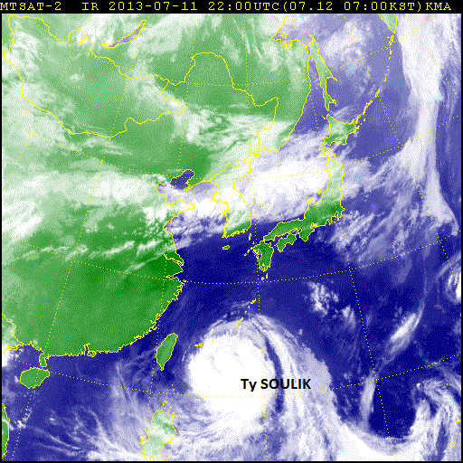К острову Тайвань со скоростью 20-25 км/час приближается мощный тропический шторм SOULIK. Сегодня утром SOULIK находился в Филиппинском море, в районе с координатами 22.6 с.ш. и 127 в.д. Тайфун стал заполняться — давление в центре тайфуна выросло до 945 гПа, максимальная скорость ветра в центре достигает 40-45 м/с, порывы ветра 60 м/с, радиус штормового ветра около 250 км, высота волн — 8-10 метров. Первыми на пути тропического шторма оказались южный остров Японского архипелага Рюкю. Сегодня разгул стихии здесь в полном разгаре. Штормовой ветер и сильный дождь сохранятся в течение текущего дня.