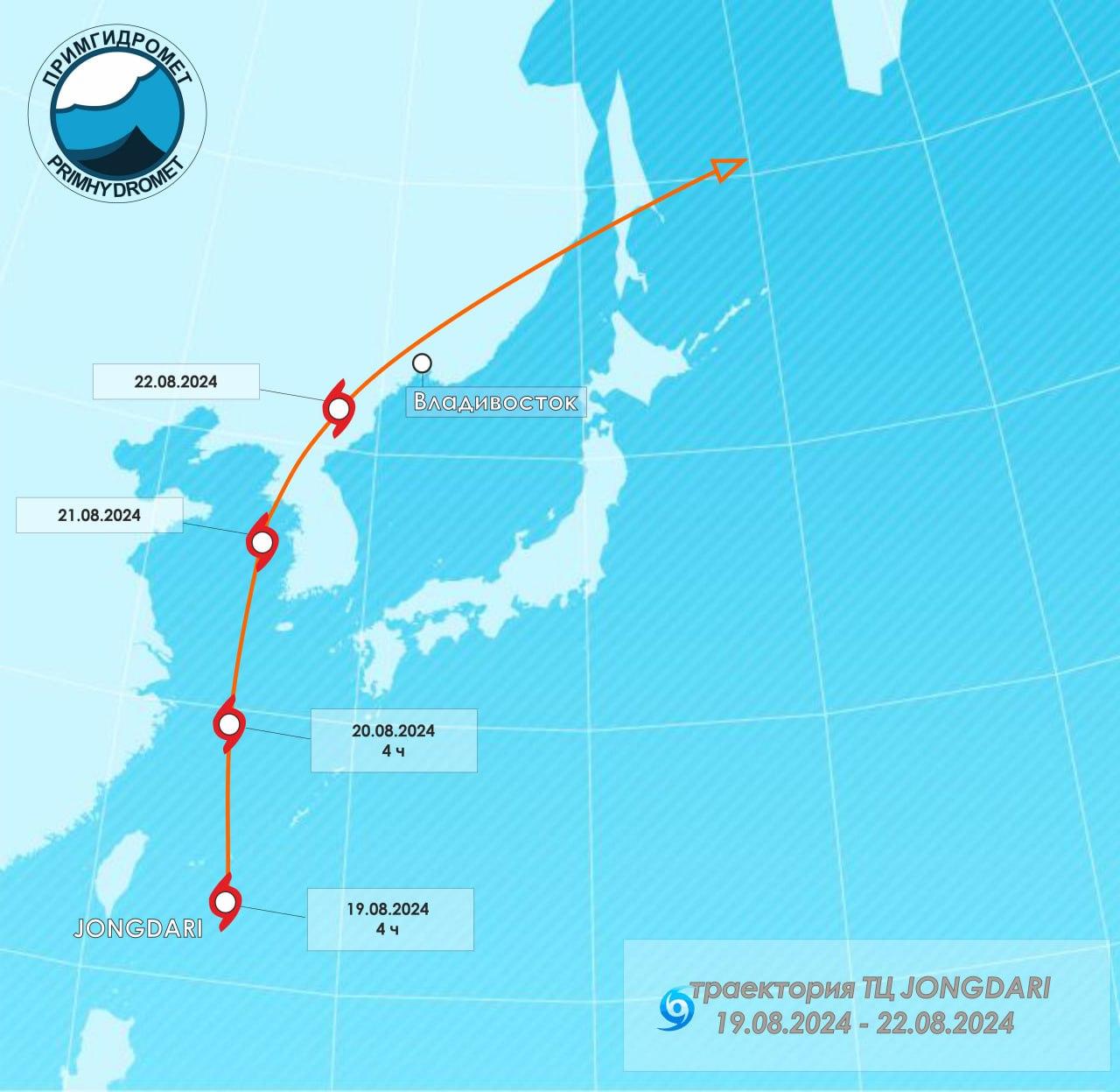 В ночь на 22 августа переместится на Северную Корею и войдет в систему полярного фронта, а в четверг днем выйдет на Приморский край. В дальнейшем станет смещаться над территорией Приморья и в конце дня 23 августа уйдет на север Японского моря.