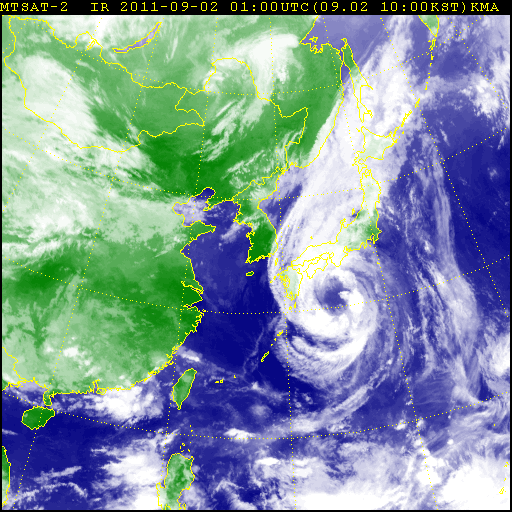 На южные острова Японского архипелага приближается мощный тайфун «TALAS». В течение последних трех суток давление в центре оставалось без изменения (965гПа). Сегодня утром тайфун «TALAS» вышел в район с координатами 29.3° с.ш. и 135.1° в.д., максимальный ветер вблизи центра достигал 33 м/с, радиус ураганного ветра составляет 240 км, сильного — около 600 км, высота волн 7-8 метров Медленно смещался на северо-северо-запад.